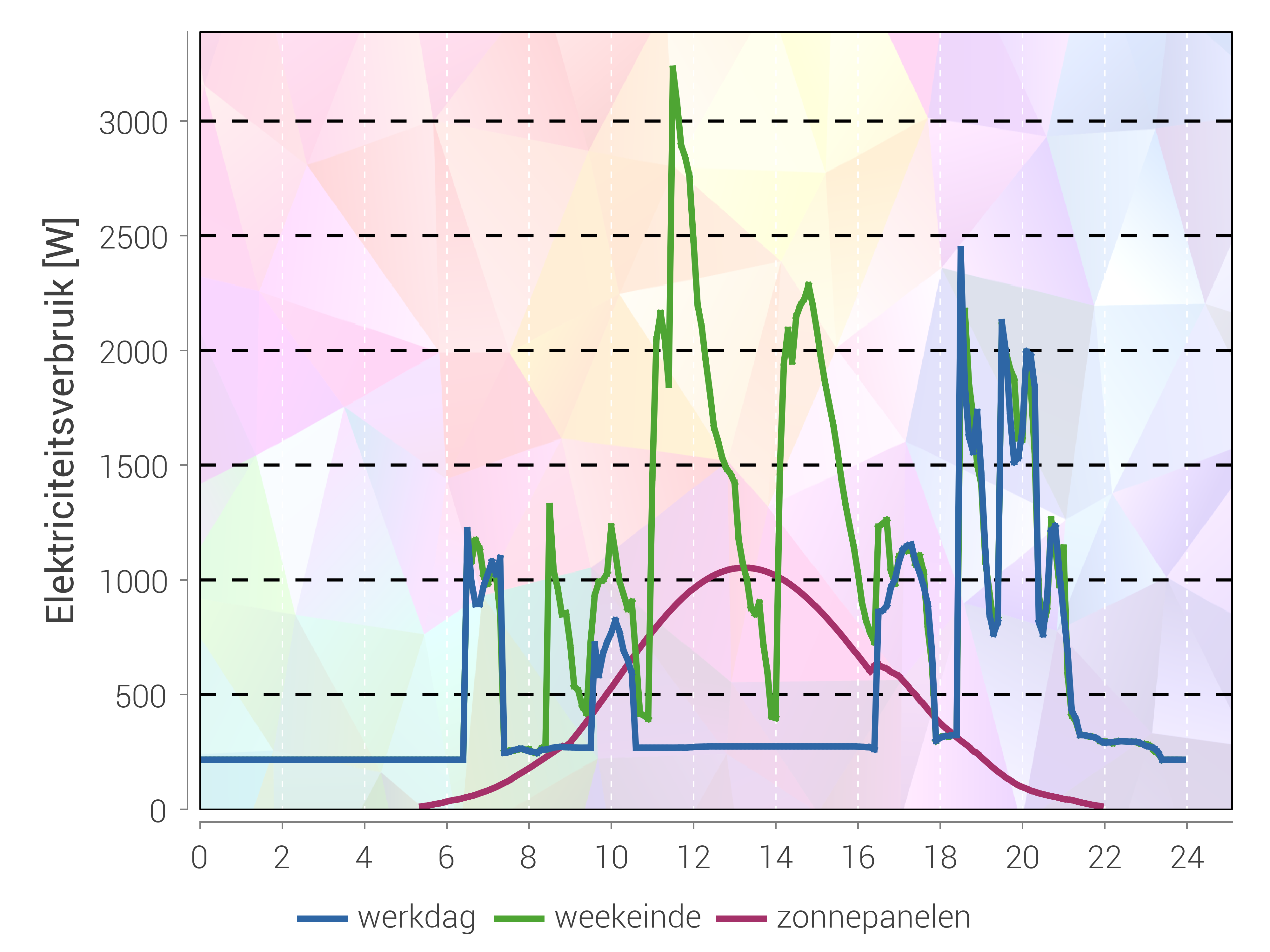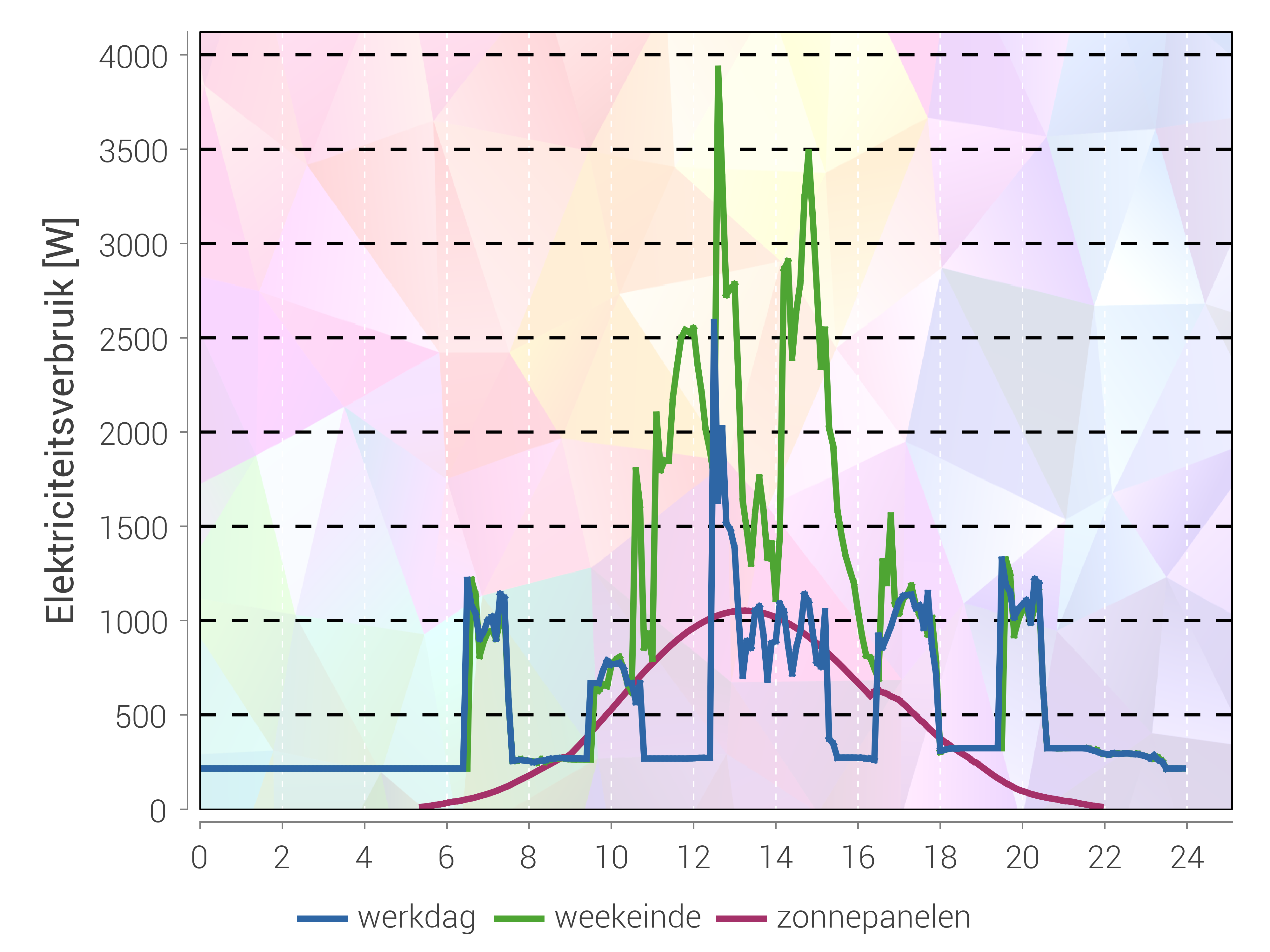 Natuurlijk kun je niet alles naar het midden van de dag verschuiven: in de ochtend zet je een kop thee en meestal kijk je ‘s avonds naar TV. Toch zie je dat je een behoorlijke verschuiving van het gebruik kunt realiseren. Dit doe je door apparatuur aan te schaffen die, mogelijk via een huisautomatisering, op een vooraf bepaalde tijd kan inschakelen. De stroomrekening van deze woning gaat met 27% omhoog, toch 6% minder.
